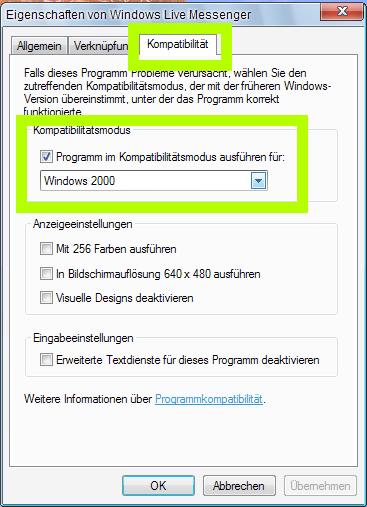 Nun öffnet sich ein neues Fenster wählen Sie hier Kopatiebilität aus. Setzen Sie den Hacken für den Kompatibilitätsmodus und wählen Sie windows 2000 aus. Bestätigen Sie das Fesnter mit ok und statrten Ihre Messenger neu. Der Messi führt eine Wartungsoption aus und startet dann.