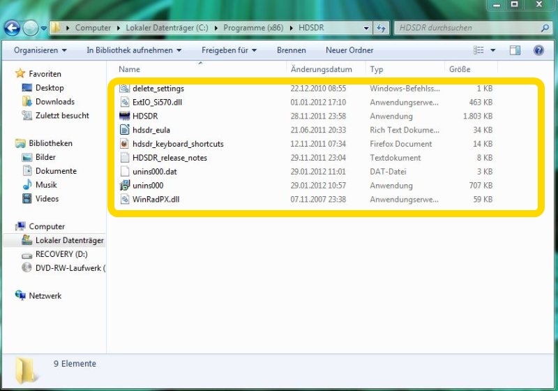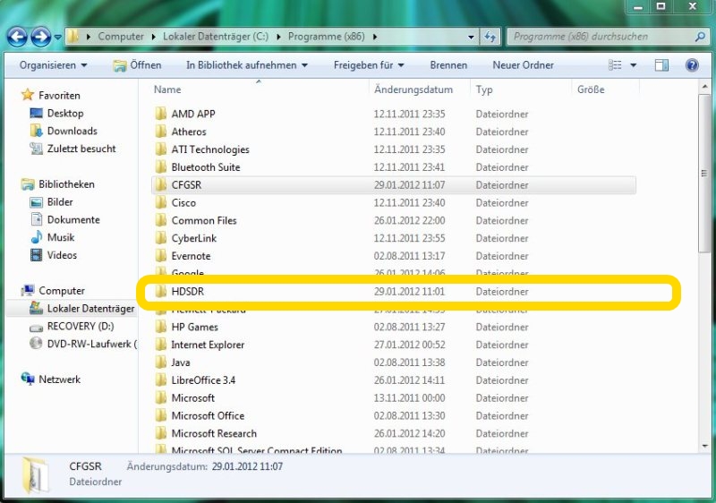 Gehen Sie wieder zurück in den Ordner "Programme(x86). Bei Windows 7, Vista und XP als 32 Bit Version gibt es diesen Ordner nicht. Sie müssen den Ordner "Programme" öffnen. Öffnen Sie den Ordner HDSDR. |