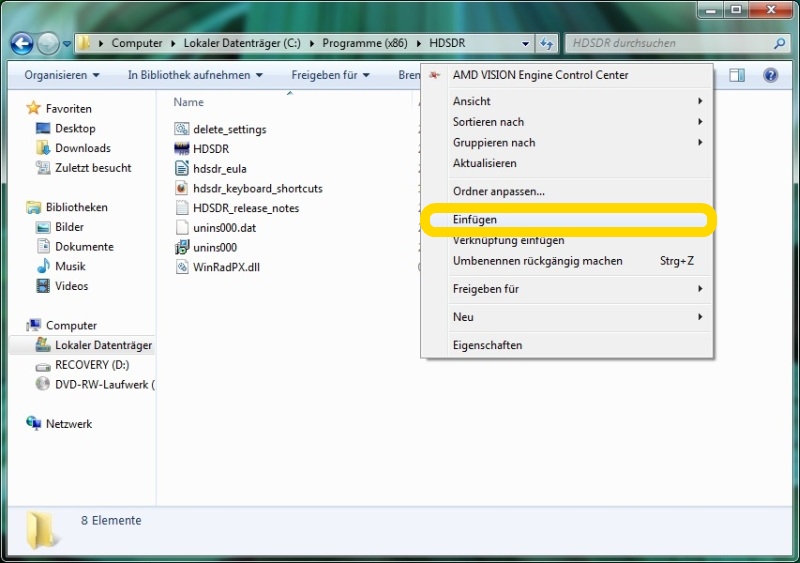 | Im Ordner HDSDR klicken Sie wieder die rechte Maustaste und wählen "Einfügen" |