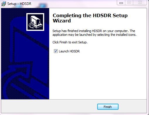 | Fertig, das wars schon. Die Auswahl "Launch HDSDR" startet das Programm nach Beendigung der Installation. Sie müssen gegebenenfals noch einen Treiber oder eine Dll für Ihren Empfänger installieren, um HDSDR optimal nutzen zu können. Sehen Sie dazu in unsere Hilfsartikel die wir bereitgestellt haben. klcken Sie auf Finish. |