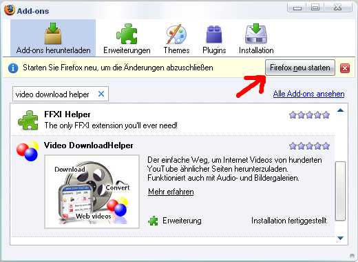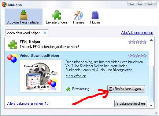 Auf der gleichen Seite erhalten Sie auch das für den Video Download nötige Add-on. Das kleine Zusatzprogramm mit dem Namen Video Download Helper macht es überhaupt erst möglich, die Videostrams aus dem Internet auf die lokale Festplatte zu bannen. Bitte laden Sie dieses Tool ebenfals herunter.